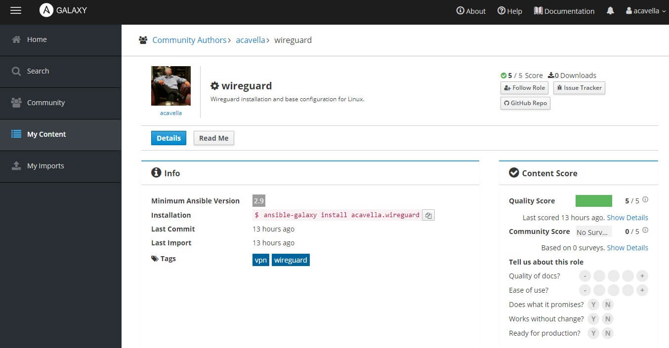 The purpose of this role is to install Wireguard on Linux. The role includes OS specific tasks that should allow it to work on any system. The role installs a simple server and generates the keys for a single client user. It has been tested on Debian, Ubuntu, CentOS and Fedora.