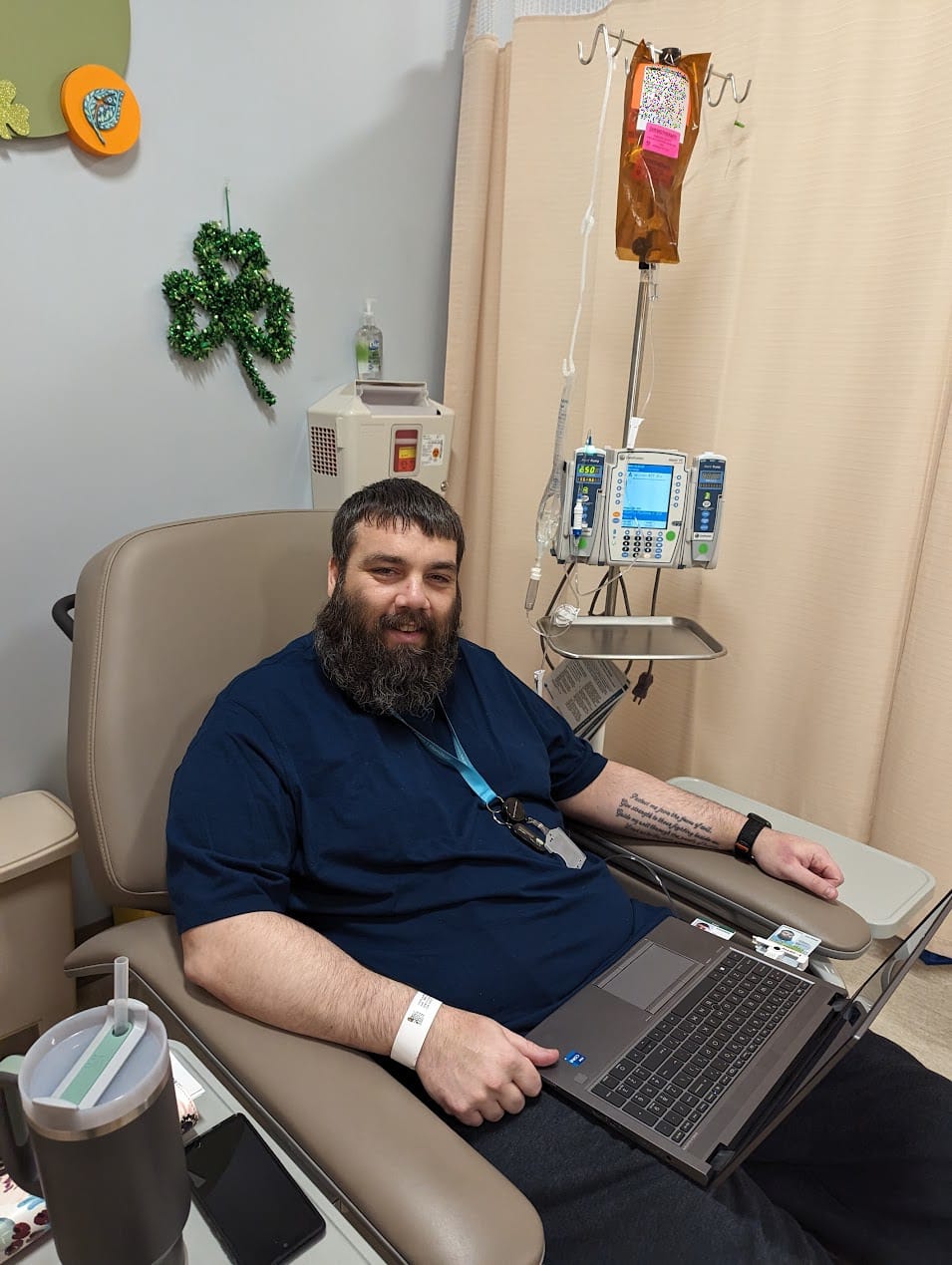 During this treatment I have continued to work. I show up for my treatment in the morning with my laptop and 5G hotspot. Once I'm hooked up to the IV and the nurses have gotten everything started, I'm pretty much free to setup my laptop and work remotely for the day. Once every now and then the nurse will come over and switch out my drugs or tend to the fluids.